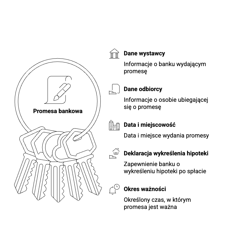Dokładny zakres danych, które widnieją na promesie, zależy od konkretnego banku. Zazwyczaj podane są następujące informacje: