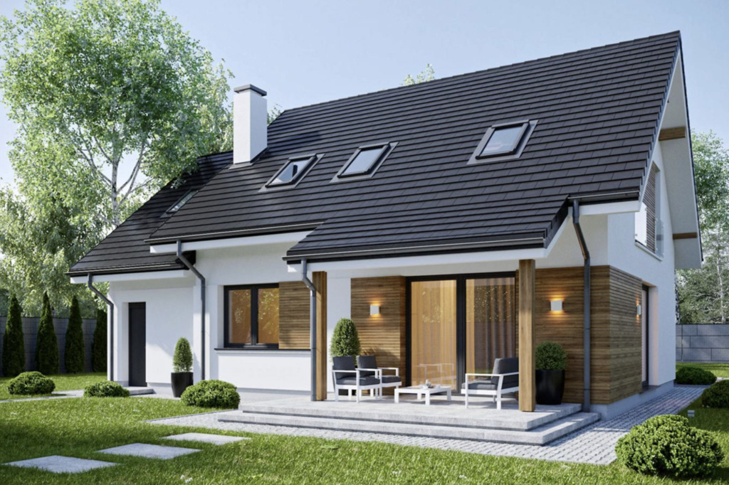 Projekt przewiduje: parterowy dom murowany o powierzchni całkowitej 178,40 m² (116,40 m² użytkowej), z 6 pokojami (3 sypialnie), 2 łazienkami, kuchnią z jadalnią oraz garażem.