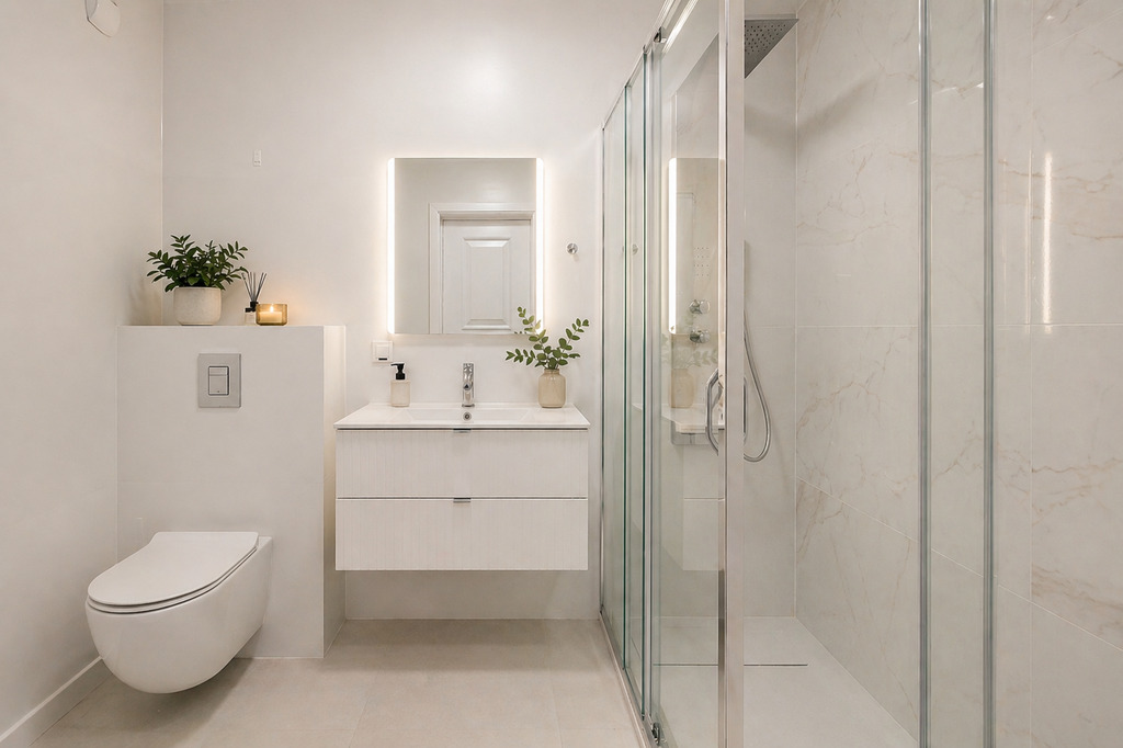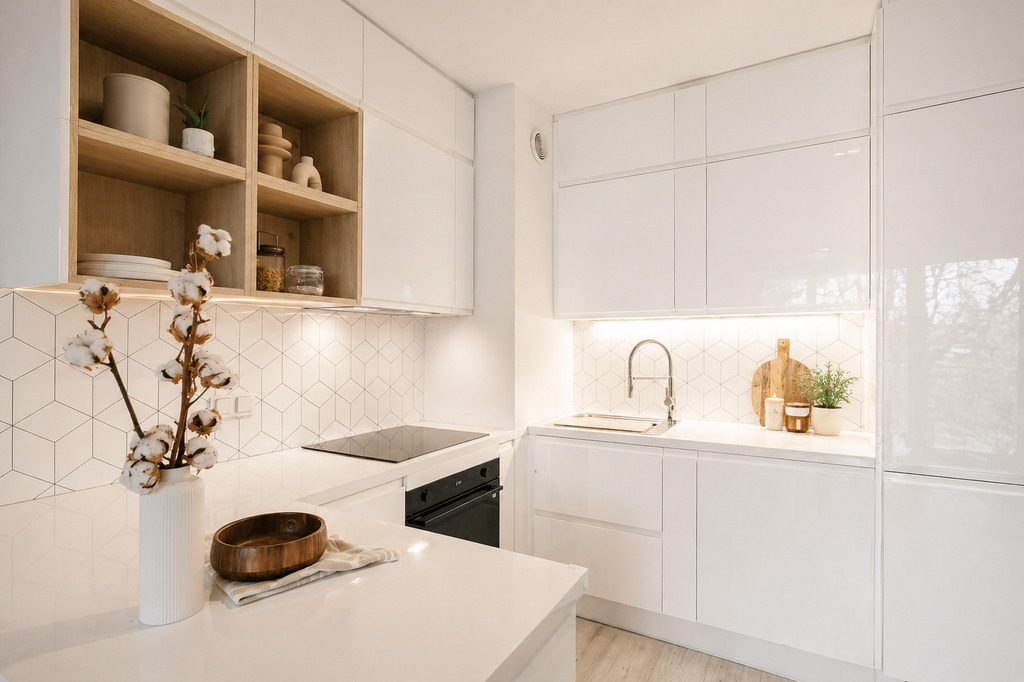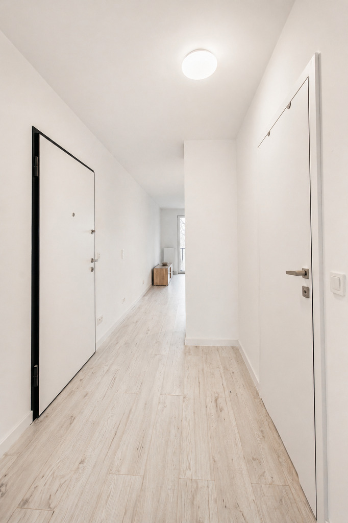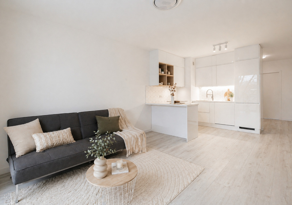 - Jasne, spójne wnętrza w neutralnych barwach
