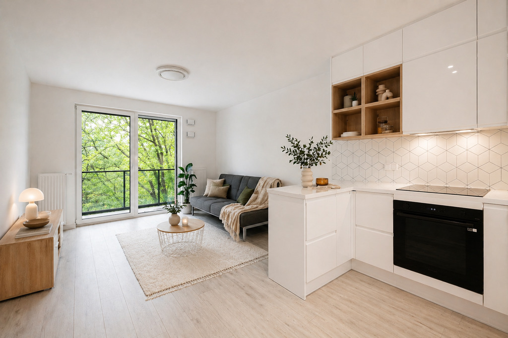 -Salon z aneksem kuchennym i wyjściem na duży balkon