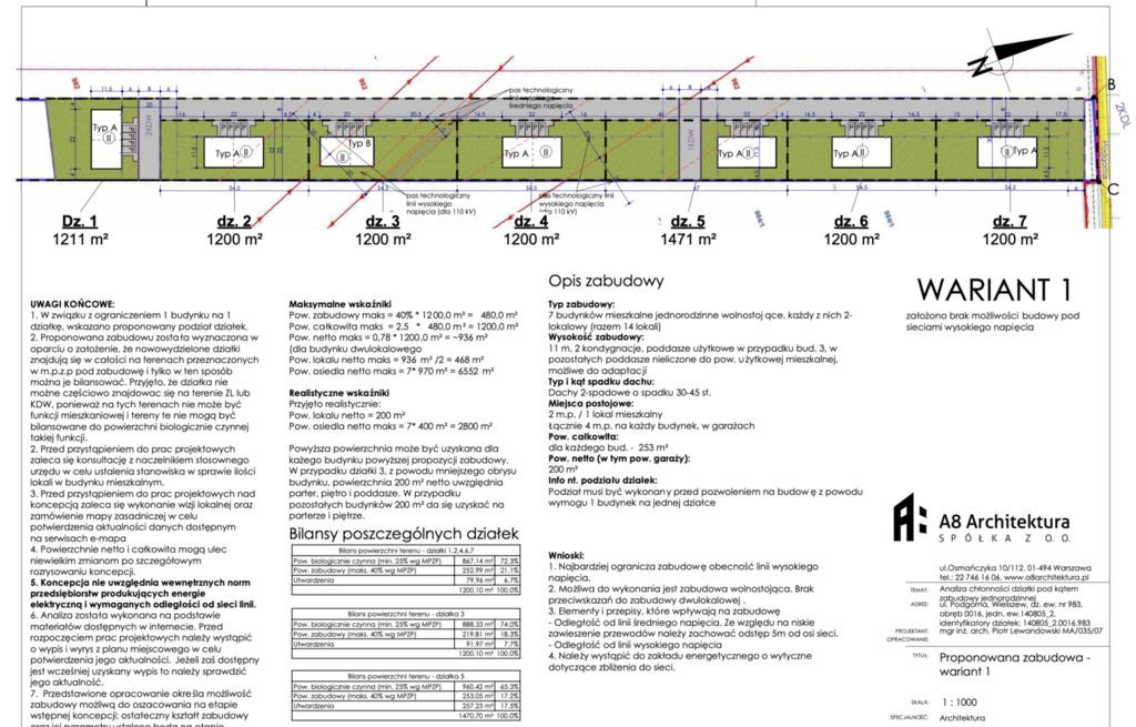 Na potrzeby oferty została wykonana analiza chłonności, która wykazała możliwość realizacji 14 lokali w zabudowie bliźniaczej (7 budynków dwulokalowych), każdy o ok. 200 m² powierzchni użytkowej netto, z dużymi ogrodami i funkcjonalnym układem.