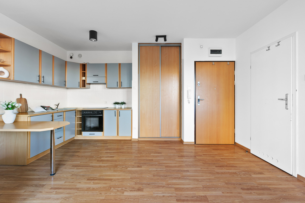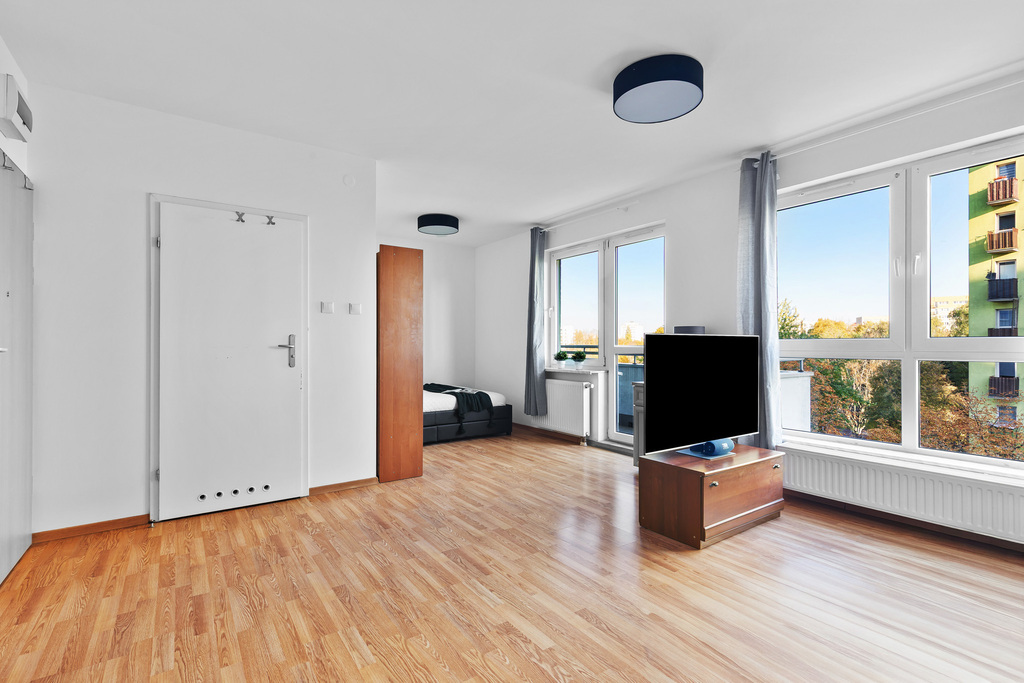 Mieszkanie, w aktualnym układzie studia z wnęką na sypialni które może stać się dwupokojowym mieszkaniem.