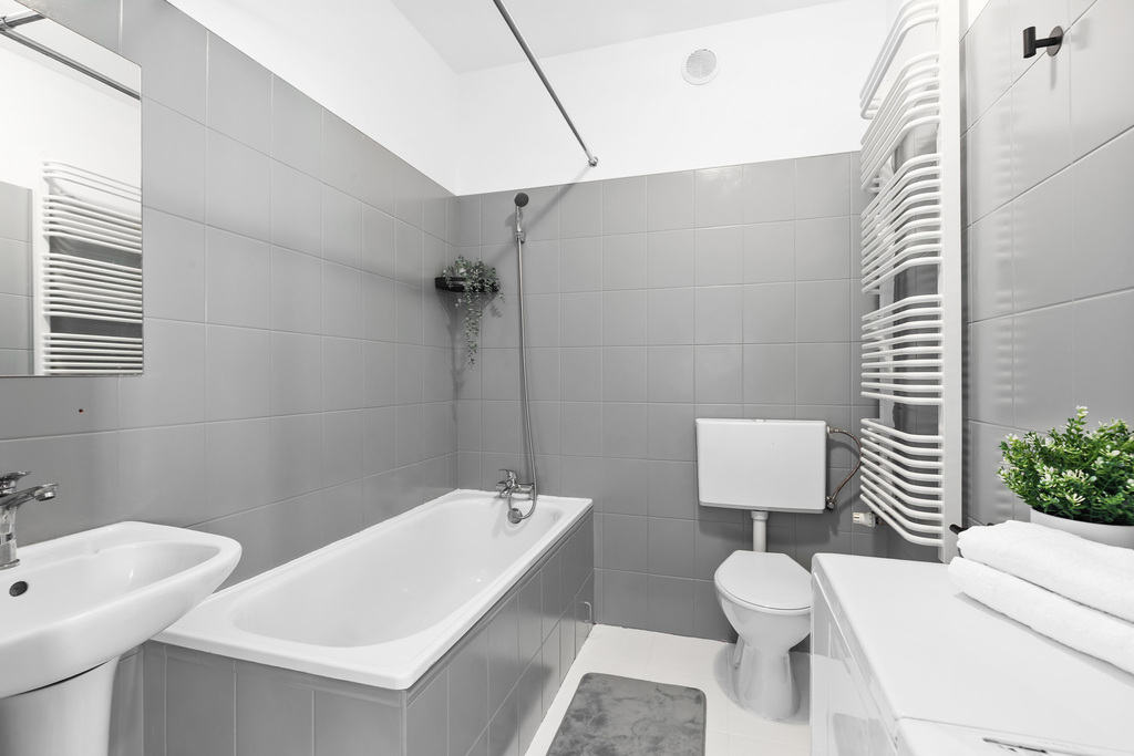 - Duża łazienka z wanną dobrze umiejscowiona względem mieszkania.