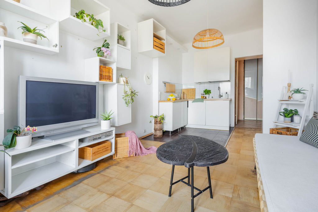 - Salon z aneksem kuchennym – serce mieszkania i przestrzeń do wspólnego spędzania czasu