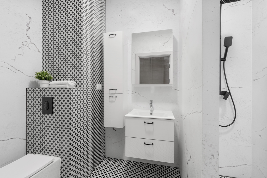 • Łazienka – eleganckie, nowoczesne oświetlenie, nowa armatura i ponadczasowy styl.