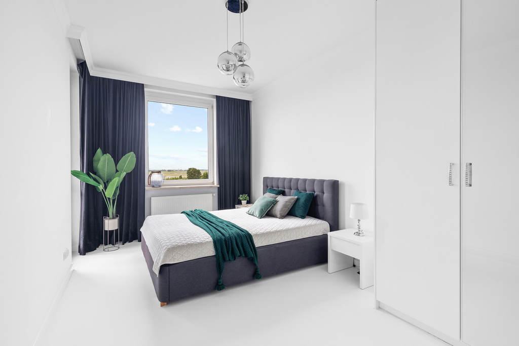 - Sypialnia z dużą szafą w zabudowie i… drzwiami balkonowymi – jeszcze więcej światła i możliwości
