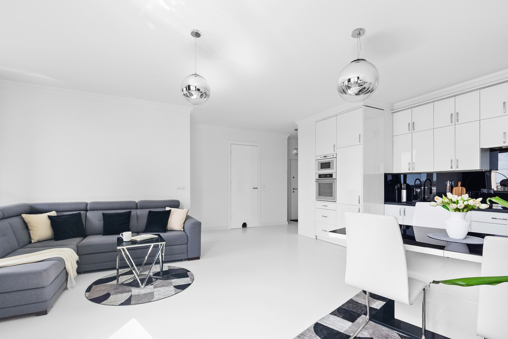 Podłogi w całym mieszkaniu pokrywa biała wylewka – nowoczesna, minimalistyczna i świetnie współgrająca z aranżacją wnętrz.