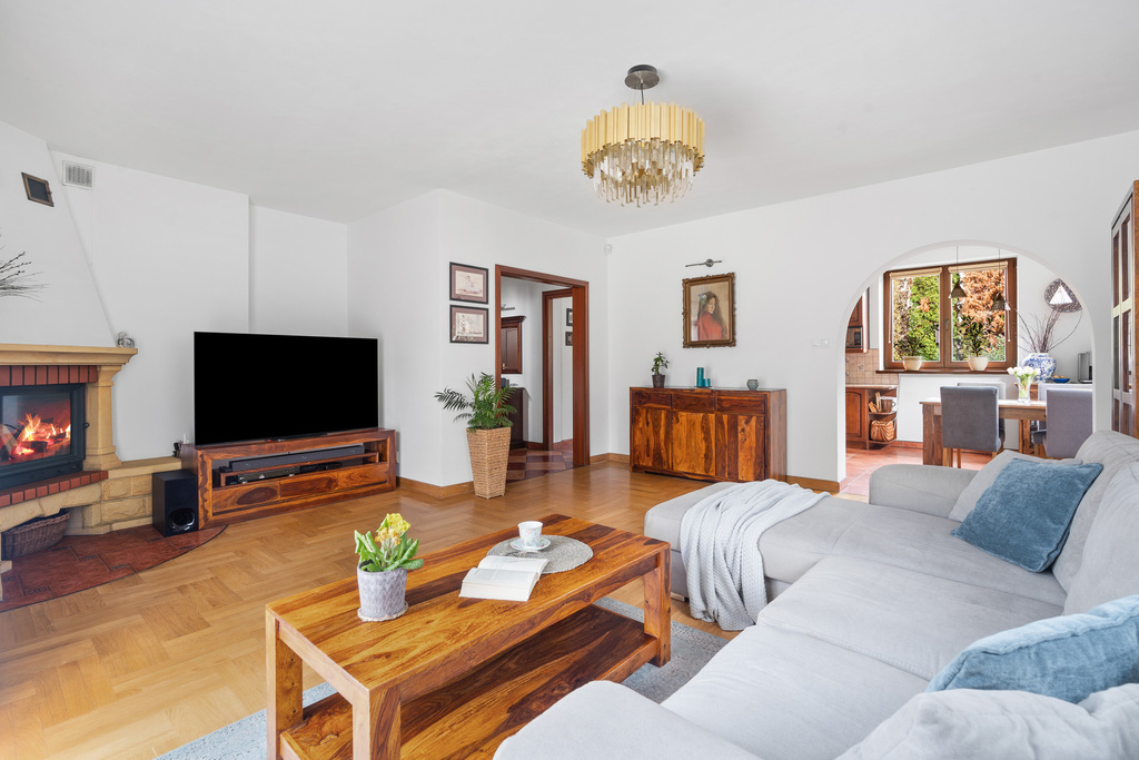 - Przestronny salon z kominkiem i wyjściem na taras – prawdziwe serce domu