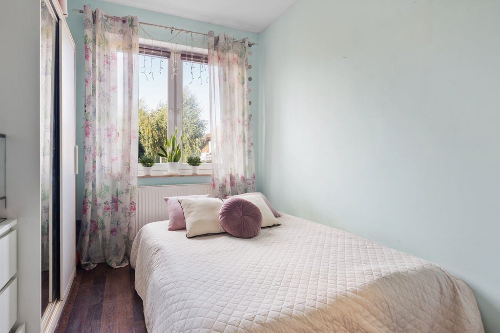 – Sypialnia z dużą szafą w zabudowie oraz pojemna szafa w korytarzu ułatwiają przechowywanie i utrzymanie porządku.