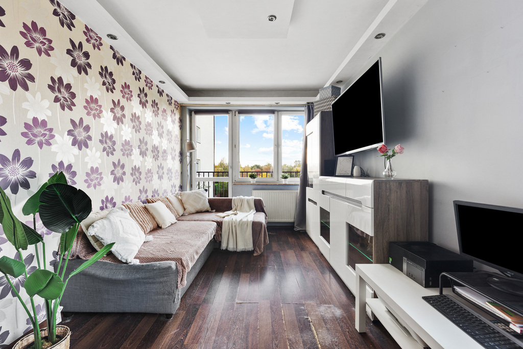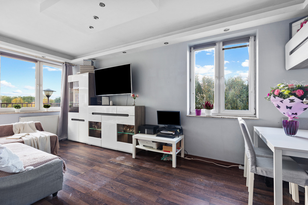 - Funkcjonalny układ – salon z balkonem, osobna sypialnia, widna kuchnia, pojemne szafy