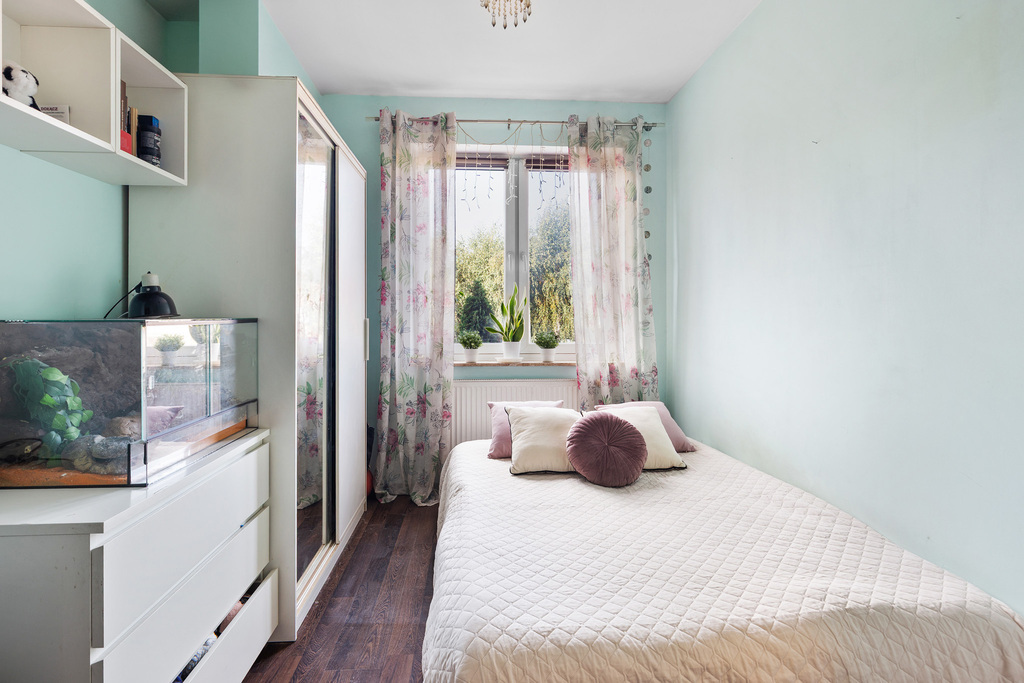 – Sypialnia z dużą szafą w zabudowie oraz pojemna szafa w korytarzu ułatwiają przechowywanie i utrzymanie porządku.