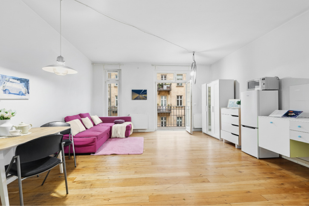 Studio 1 (ok. 30 m²) – jasne i przestronne, z dużymi oknami od podłogi do sufitu oraz francuskim balkonem wychodzącym na ul. Nieporęcką.