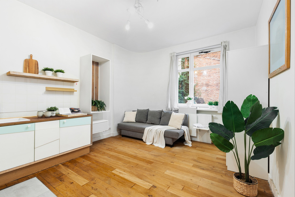 Studio 2 (ok. 20 m²) – kameralne, bardzo ciche, z oknem na wewnętrzne podwórze, idealne np. na sypialnię lub prywatny gabinet.