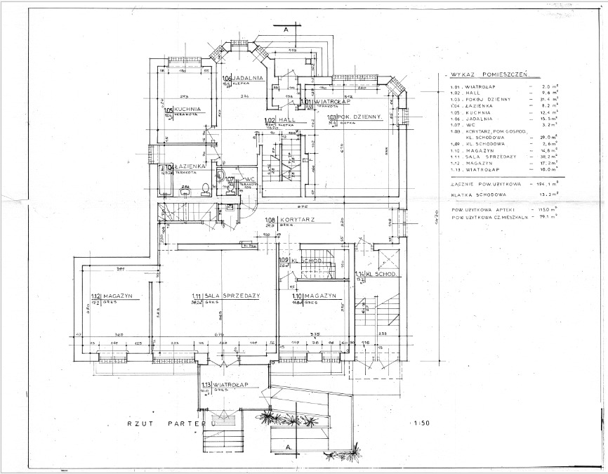 Główny budynek posiada 5 kondygnacji (w tym 1 kondygnacja podziemna posiadająca dostęp do światła dziennego) oraz został oddany do użytku w 1992 rokuOd początku budynek spełniał funkcję mieszkalną oraz handlowo- usługową. W nieruchomości działała apteka oraz biura. W 2019 roku został doprowadzony światłowód oraz zamontowano instalację fotowoltaiczną. Konstrukcja budynku pozwala na elastyczne rozplanowanie przestrzeni zgodnie z potrzebami nowego właściciela.