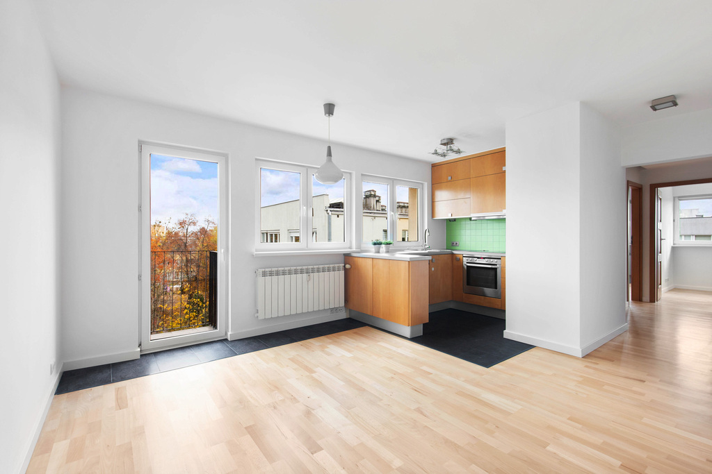 - Duży salon z aneksem kuchennym i balkonem – w pełni wyposażona kuchnia w sprzęty AGD a wycyklinowana podłoga dodaje jasności i świeżości.