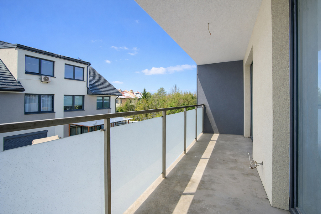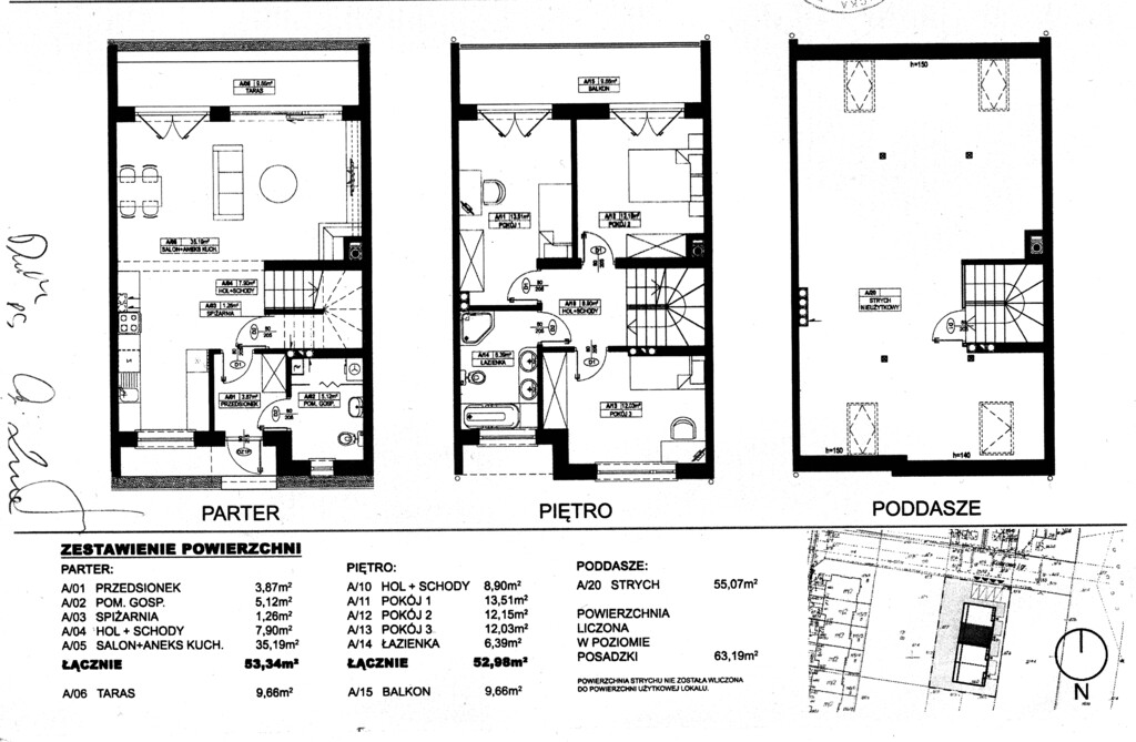 Piętro (52,98 m²): trzy pokoje, łazienka z przygotowaną instalacją pod dwie umywalki oraz prysznic typu walk-in, balkon 9,66 m².