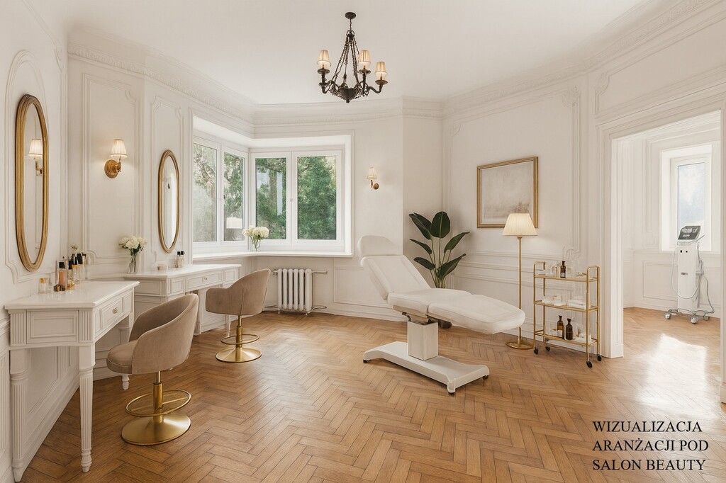 Pokoje są przechodnie, co pozwala stworzyć płynny, elegancki układ – idealny dla salonu beauty, studia urody, gabinetu kosmetologicznego lub konceptu wellness & lifestyle.