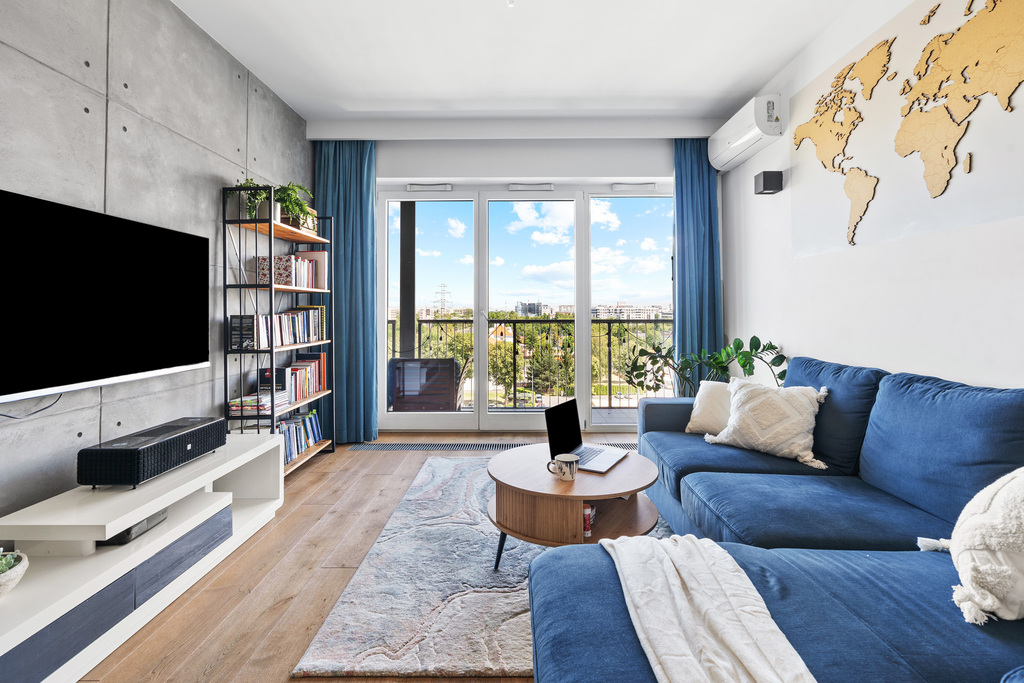 - salonu z wyjściem na balkon i ogromnymi oknami;