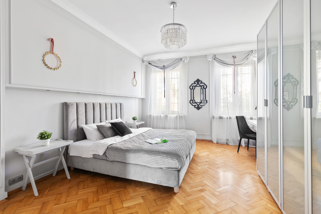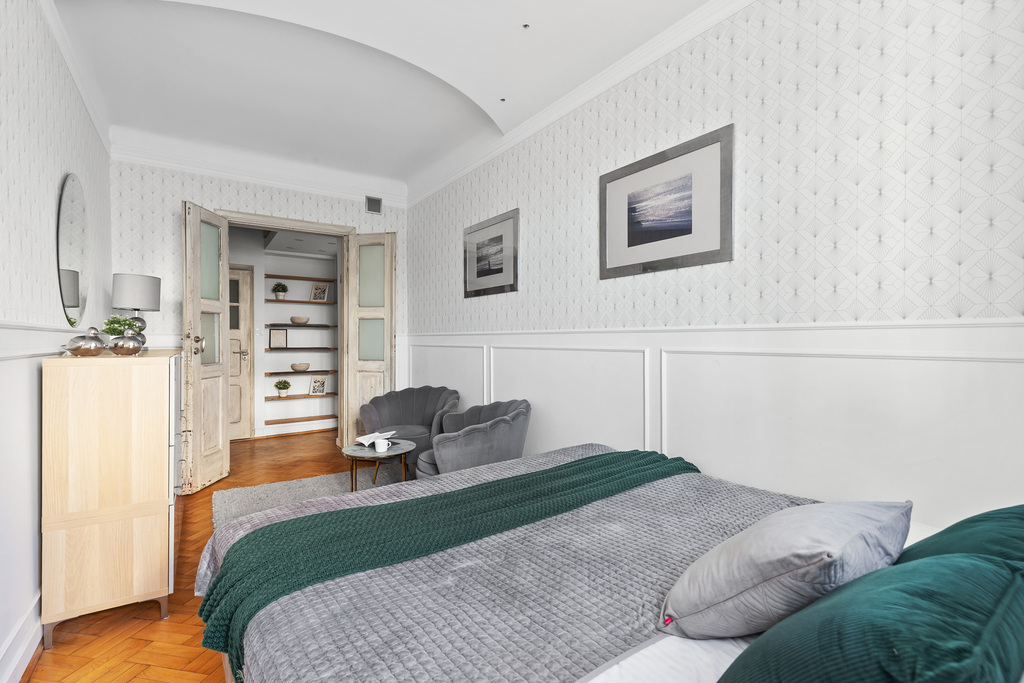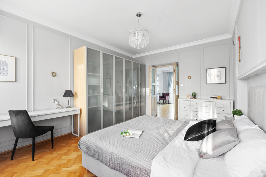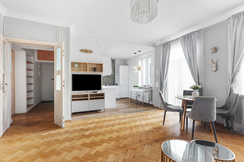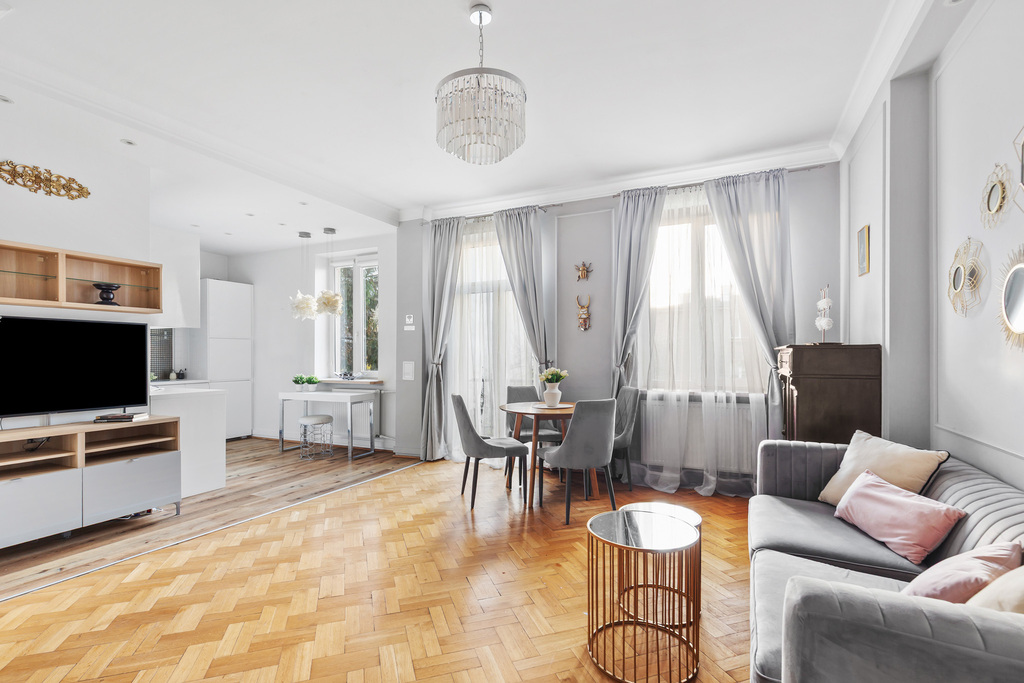 Wnętrze jest gotowe do zamieszkania, przytulne i eleganckie. Drewniana podłoga oraz sztukateria nadają mu wyjątkowego, ponadczasowego charakteru, zostało wykończone w klasycznym stylu glamour, z dbałością o detale i zachowaniem ducha przedwojennej architektury.