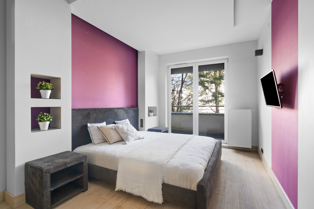 ● Główna sypialnia- z dużym łóżkiem, szafą i wyjściem na balkon