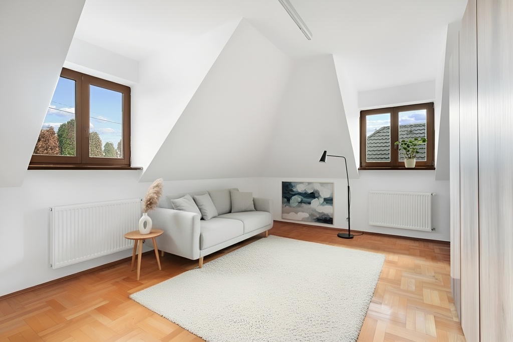 - Poddasze ok. 80 m² do własnej aranżacji (np. 2 pokoje, gabinet, siłownia).