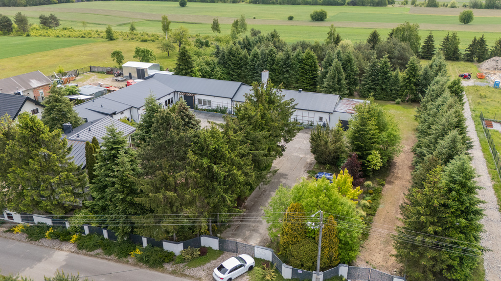 Na tej samej działce znajduje się również starannie wykończony dom mieszkalny (155 m²), który może pełnić funkcję zaplecza mieszkalnego lub reprezentacyjnego biura.