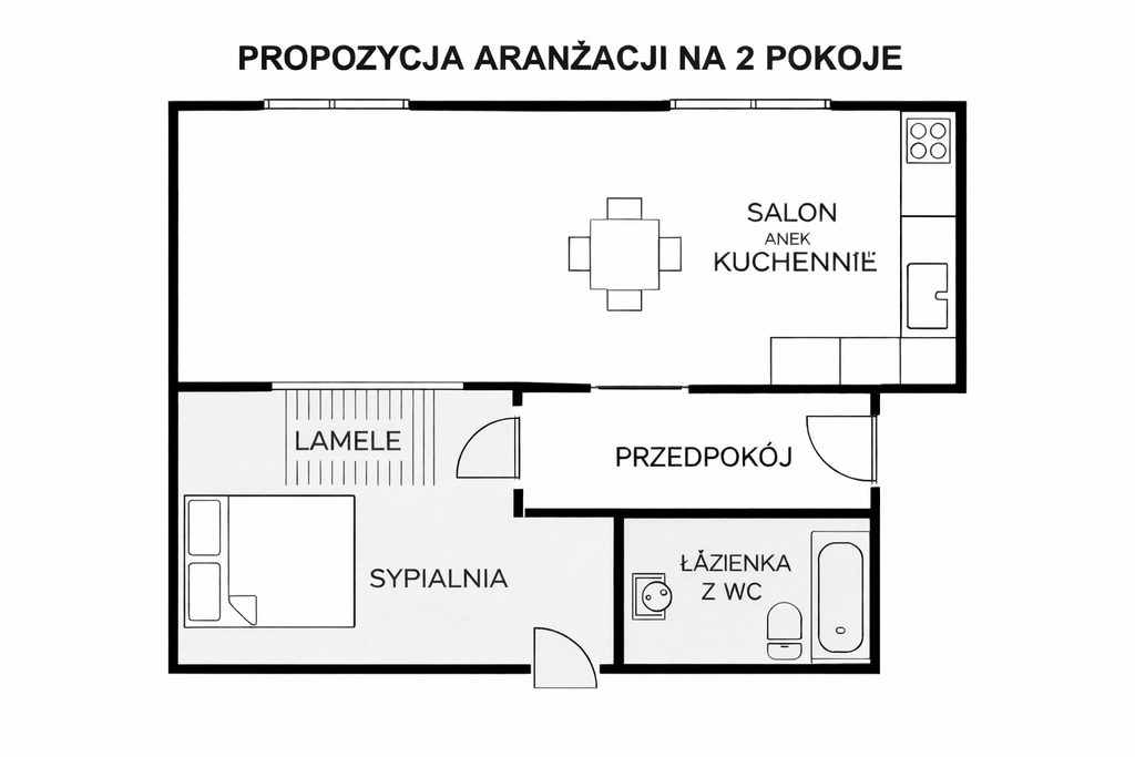 • możliwość stworzenia salonu z aneksem i oddzielnej sypialni