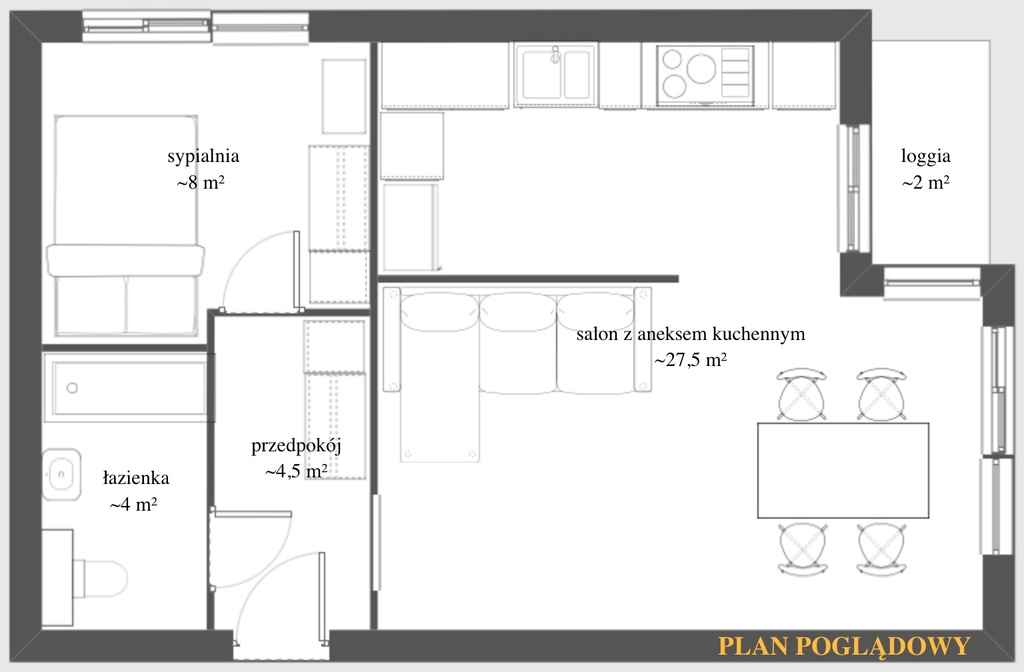 • dużego salonu z aneksem kuchennym  – serca mieszkania, idealnego do wspólnego spędzania czasu oraz wielu kulinarnych przygód,