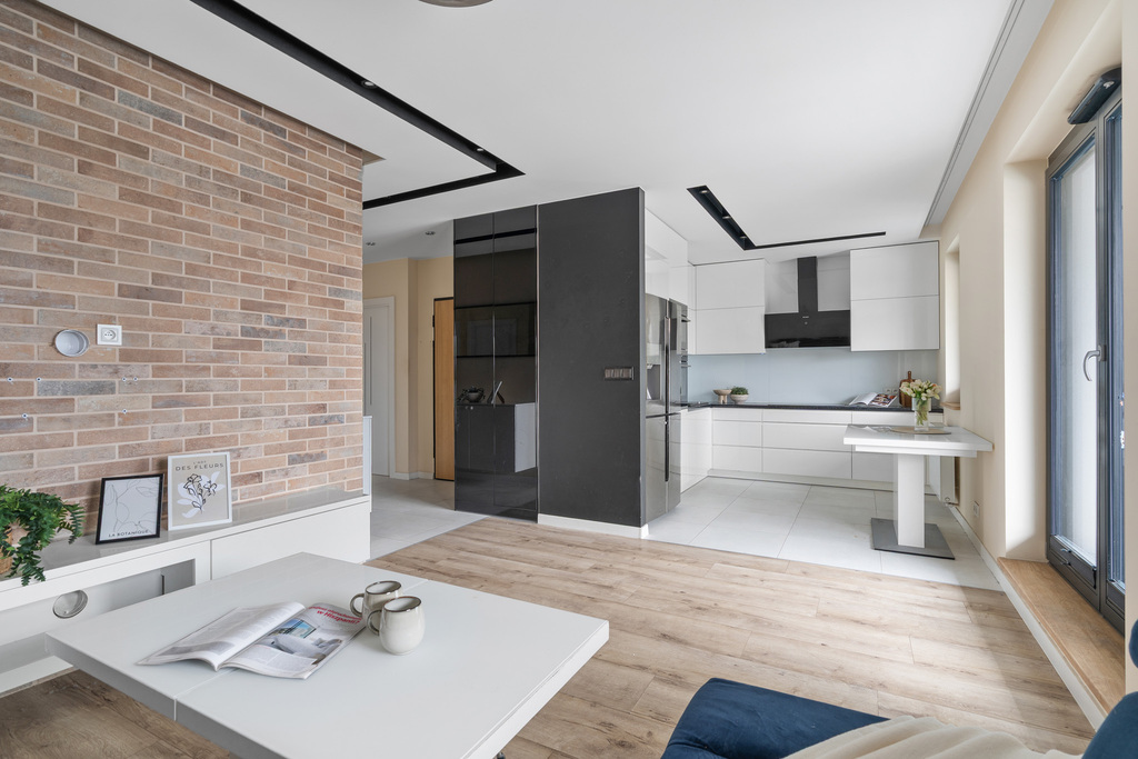 Funkcjonalny układ pozwala wygodnie oddzielić strefę wspólną od prywatnej.