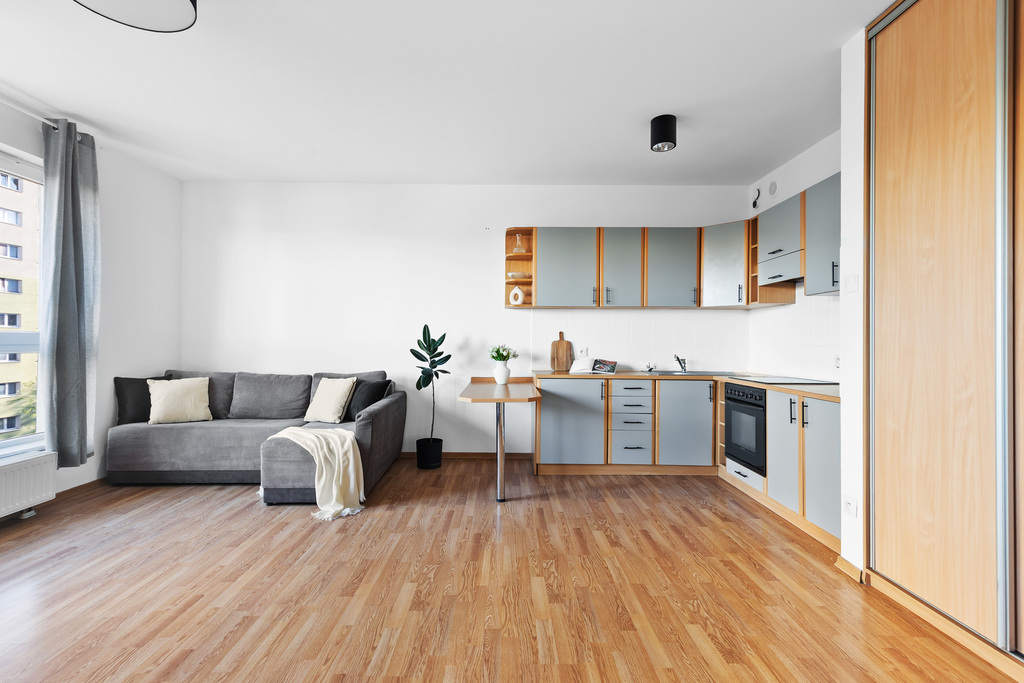 Mieszkanie, w aktualnym układzie studia z wnęką na sypialni które może stać się dwupokojowym mieszkaniem.