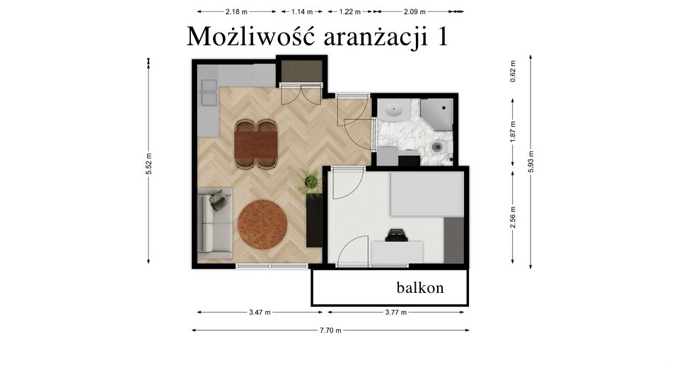 - Dwie różne możliwości aranżacji na dwupokojowe mieszkanie